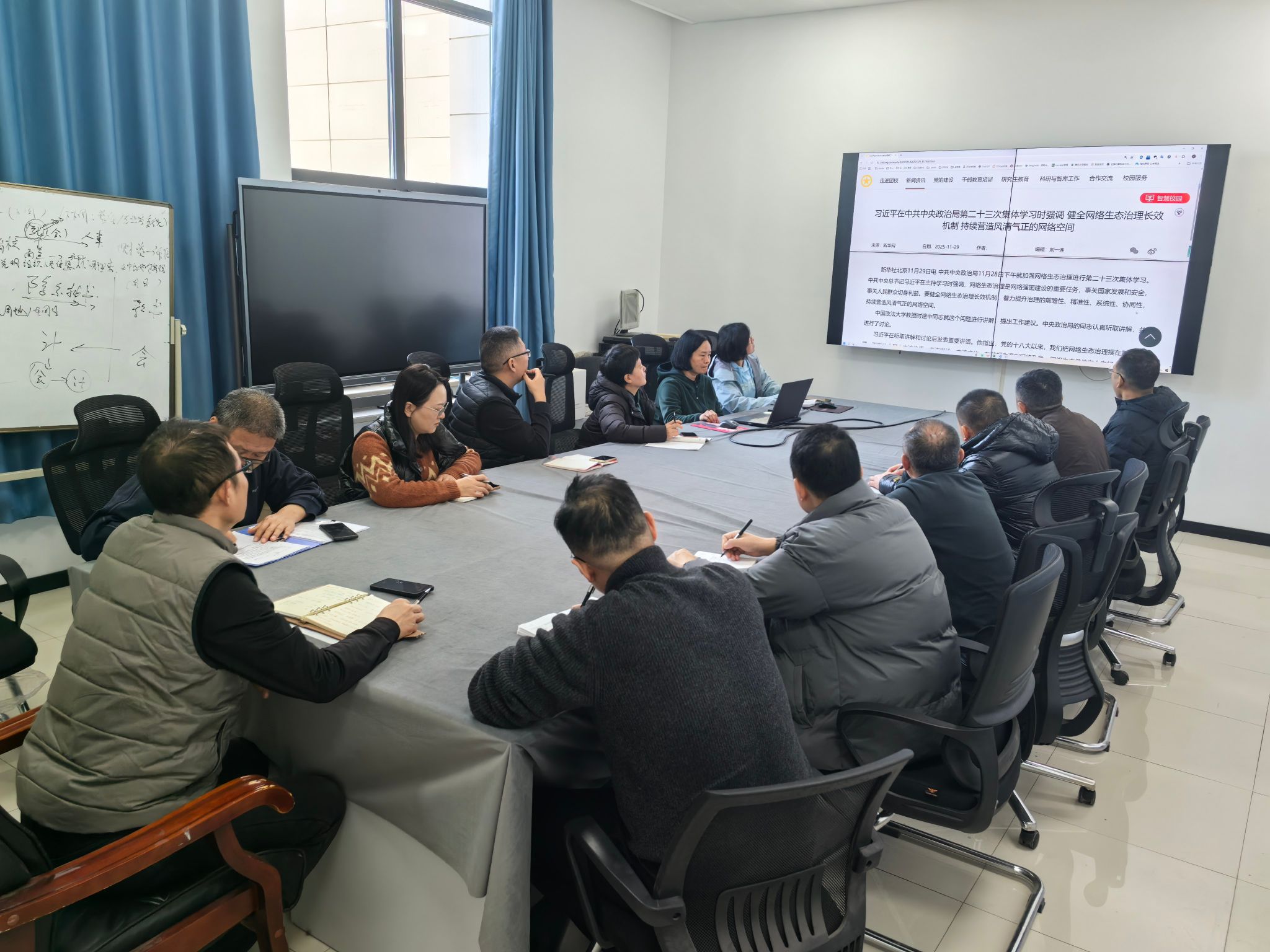 信息中心召开专题学习会议 共筑网络清朗空间2025年12月8日上午,信息中心全体正式人员在图书馆417室召开专题学习会议,传达学习习近平总书记重要讲话和重要指示精神,信息中心主任李明亮同志主持。会议强调,要深入学习贯彻习近平总书记在中共中央政治局第二十三次集体学习时的重要讲话精神,坚持党的领导、坚持人民至上、坚持守正创新、坚持法治护航、坚持系统观念,健全网络生态治理长效机制,深化党的创新理论网上宣传,有效打击遏制网络乱象,以正面声音、主流价值、...2025-12-08