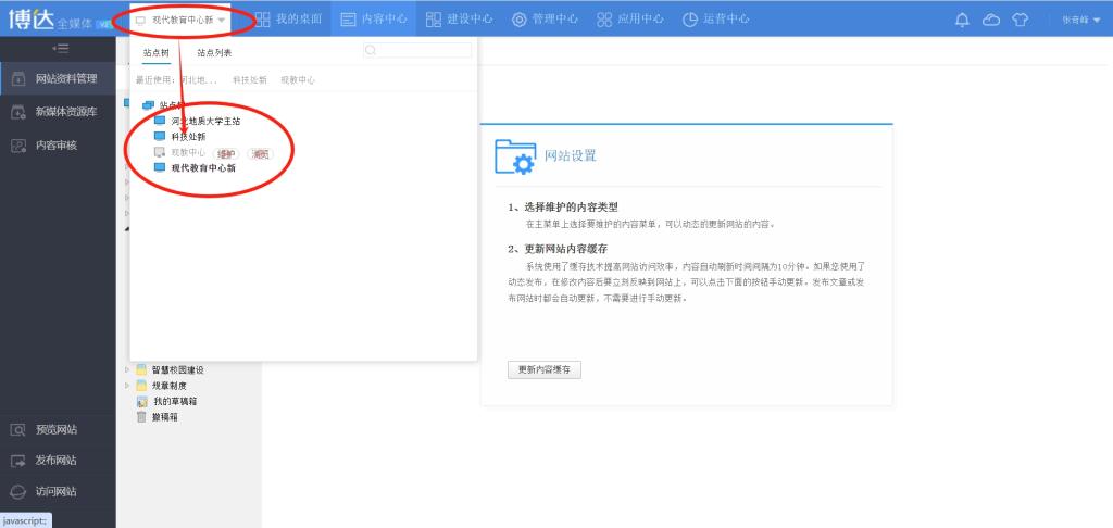 如果管理员在管理多个网站,登录后台后请在左上方选择自己需要管理的网站