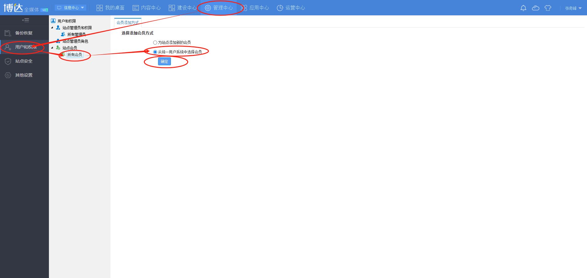 具体的操作方法是:点击“管理中心”——“用户和权限”——“所有会员”——“添加会员”——选择“从统一用户系统中选择会员”——通过工号就可以找寻添加会员了